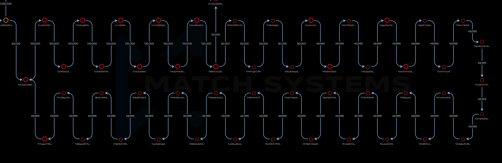 5. After completing the cross-chain transfer (after exiting the BitTorrent Bridge back to the Tron blockchain), the attacker sent the stolen 50 thousand USDT to 1 circle consisting of 5 new addresses, after which he mixed them with other 100 thousand USDT within the circle and brought 50 thousand USDT out of the circle to a new address separately.