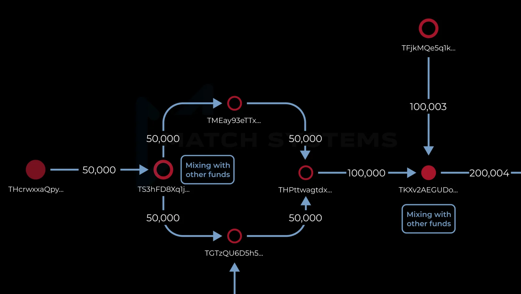 3. After exiting a long chain of transactions, the attacker mixed the stolen 50 thousand USDT with another 50 thousand USDT at one new address. After I sent it separately by 50 thousand USDT to 2 new addresses and mixed them again. Then the attacker mixed 100 thousand USDT with another 100 thousand USDT at one new address (having received 200 thousand USDT at one address ).