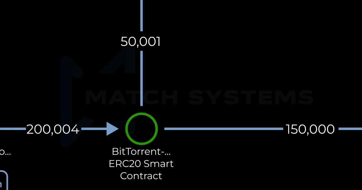 4. After the merger, the received 200 thousand USDT were sent to the BitTorrent blockchain using the “BitTorrent-Chain ERC20 Smart Contract”, where the funds were again divided into the original 50 thousand USDT and added for mixing 150 thousand USDT, and transferred back to the Tron blockchain to 2 new addresses.
