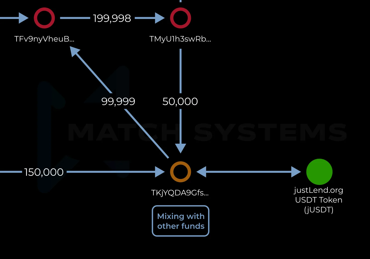6. After leaving the next round of transfers, the stolen 50 thousand USDT were sent to the final address, where the funds were again mixed with other 150 thousand USDT that had previously left the BitTorrent blockchain (this was mentioned in paragraph 4). Then the funds in the amount of 200 thousand USDT were sent to the landing cryptocurrency service “JustLend.org“.