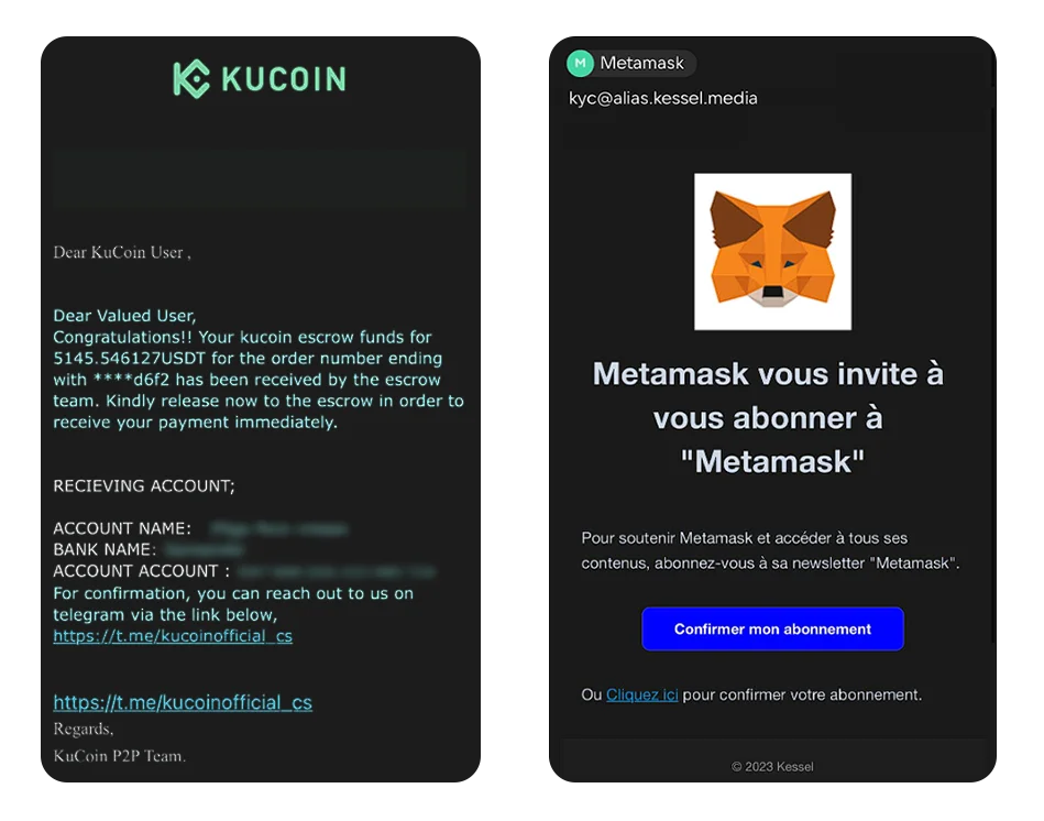 Emails that look like official messages from exchanges or wallets. For example, “from KuCoin” with a warning about a “security violation” or a message “from MetaMask.” More details from CISA.