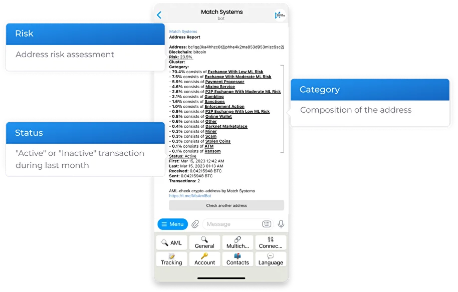Crypto wallets and transaction hashes are checked for dirty cryptocurrency via Telegram bot