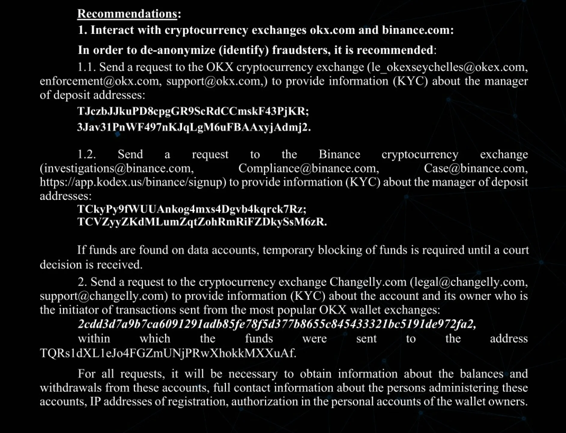 Предоставляют рекомендации: разрабатывают пошаговый план действий, включая готовые шаблоны запросов для правоохранительных органов, бирж и других вовлеченных сторон.