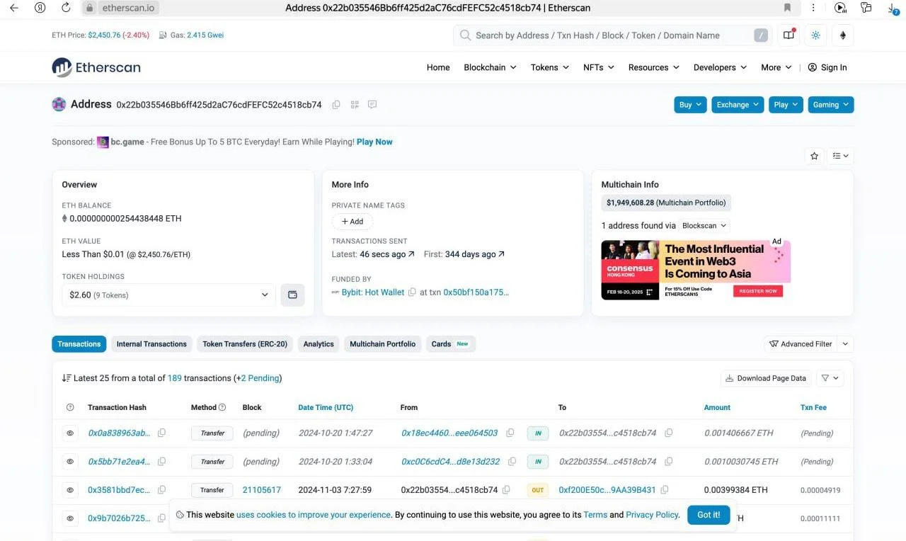 Первая заметная проблема — несоответствие данных о транзакции. На представленном скриншоте (Изображение 1) видна транзакция, якобы совершенная 20 июня 2024 года с адреса отправителя 0x22b035546Bb6ff425d2aC76cdFEFC52c4518cb74. Этот адрес принадлежит горячему кошельку Bybit (Изображение 2). Однако с этого адреса в указанную дату не было совершено никаких транзакций, соответствующих заявленной истории.