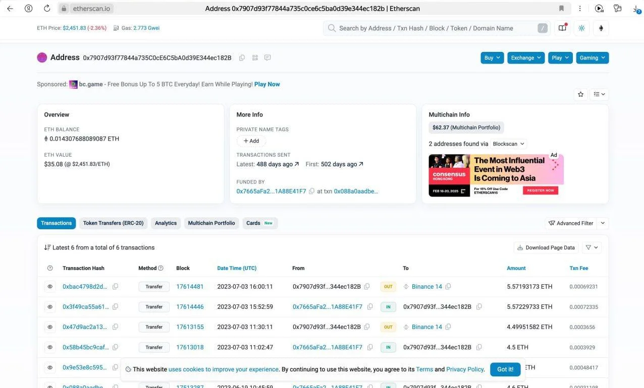 Согласно видео, адрес получателя — 0x7907d93f77844a735C0cE6C5bA0d39E344ec182B. При проверке мы обнаружили, что последняя активность по этому адресу была 3 июля 2023 года. Это делает любые последующие транзакции, в частности в июне 2024 года, невозможными. Данные блокчейна, которые открыто проверяемы, подтверждают, что таких транзакций не существует.