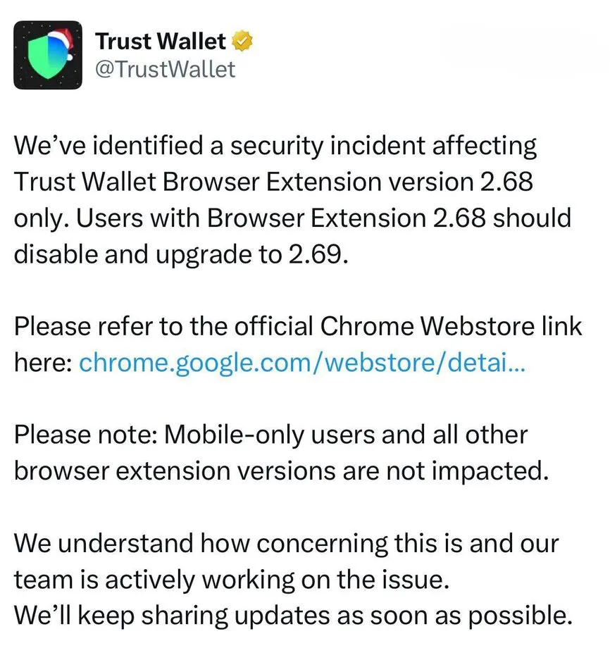 За последние 24 часа мы зафиксировали всплеск сообщений о несанкционированных выводах средств, затрагивающих пользователей браузерного расширения Trust Wallet для Chrome. Команда Trust Wallet официально заявила, что проблема касается только версии расширения v2.68, и рекомендовала отключить её и обновиться до версии v2.69. Согласно их заявлению, мобильные пользователи и другие версии расширения не пострадали.